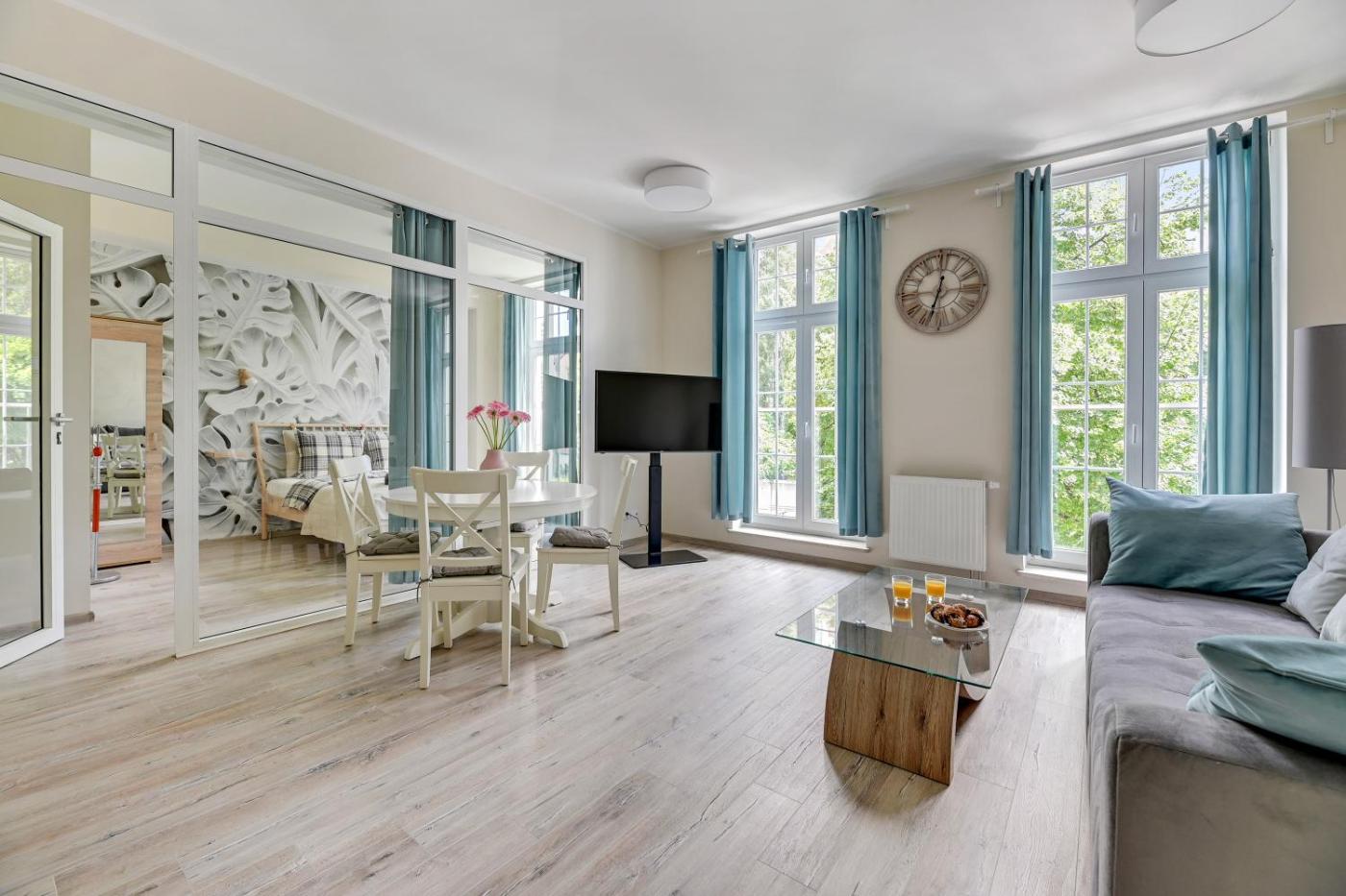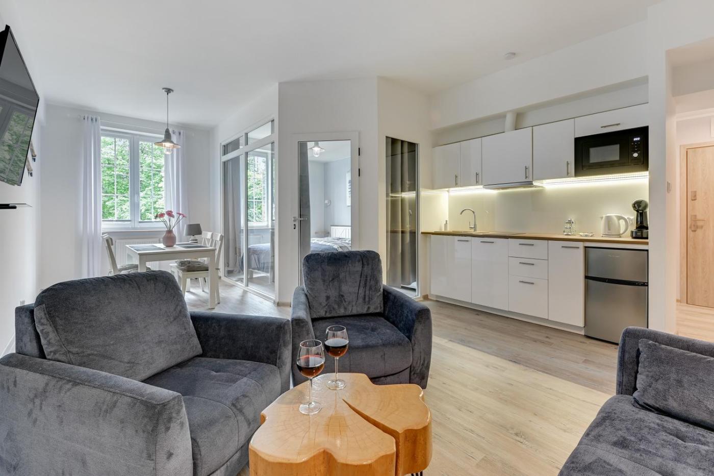 Apartament z 1 sypialnią. Ten apartament z oddzielnym wejściem mieści salon, oddzielną sypialnię oraz łazienkę z prysznicem i suszarką do włosów. Posiłki można przygotowywać w doskonale wyposażonym aneksie kuchennym z płytą kuchenną, lodówką, zmywarką do naczyń oraz przyborami kuchennymi. Udogodnienia obejmują część wypoczynkową z telewizorem z płaskim ekranem i dostępem do kanałów kablowych, pralkę, ekspres do kawy oraz jadalnię. Podłogi wyłożone są parkietem. W tej opcji zakwaterowania zapewniono 2 łóżka. Apartament - 4 osobowy. Powierzchnia pokoju ok.: 40 mkw. ;